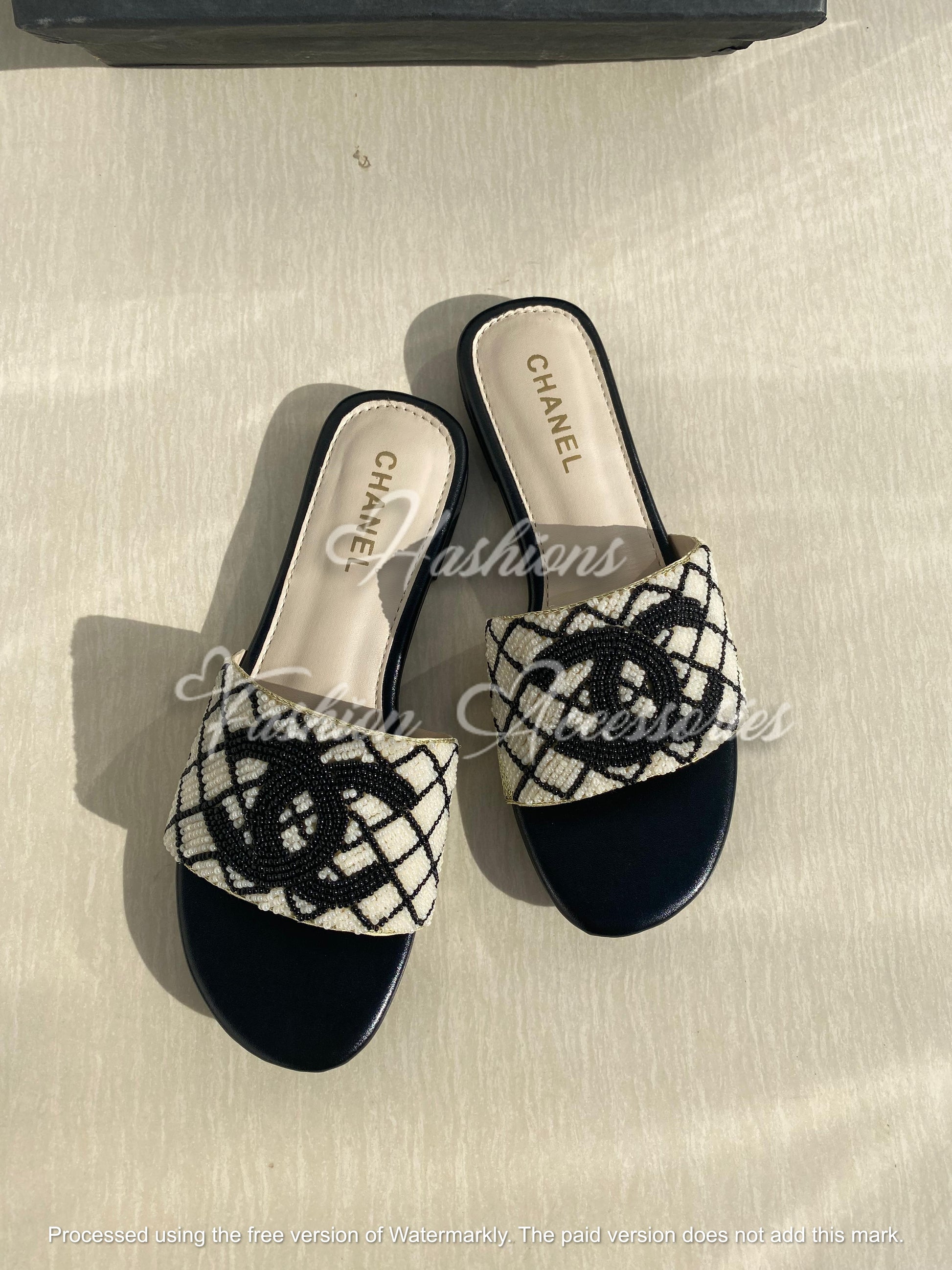 Beaded Lattice Slide Flats – Women’s Elegant Comfort Sandals (Black & Cream)