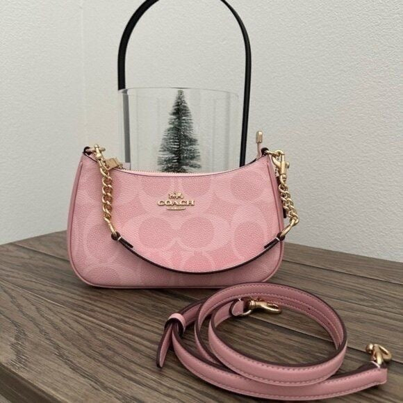 Blush Pink Monogram Shoulder Bag – Mini Crescent Design with Gold Chain