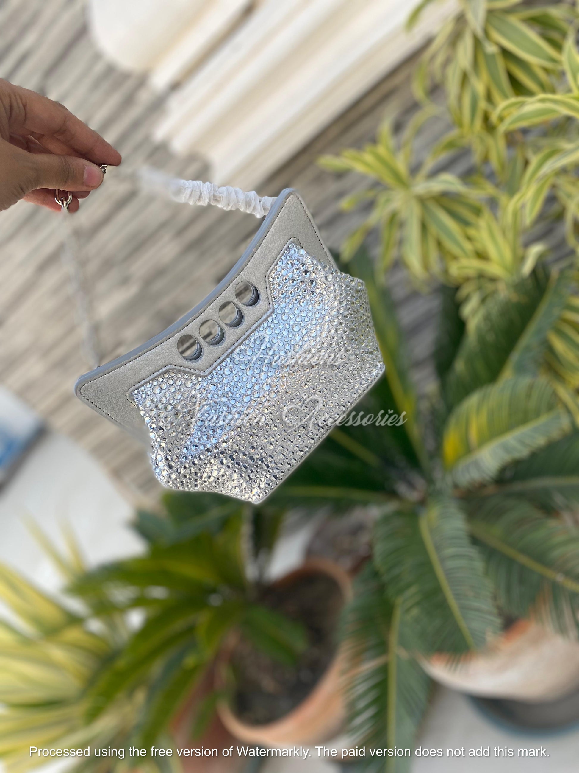 Designed with full rhinestone embellishments, metallic detailing, and a sculpted silhouette, this bag captures the perfect balance between elegance and edge. The handle features a unique cut-out design with silver chain accents, while the compact structure offers just enough space for your phone, lipstick, and essentials.