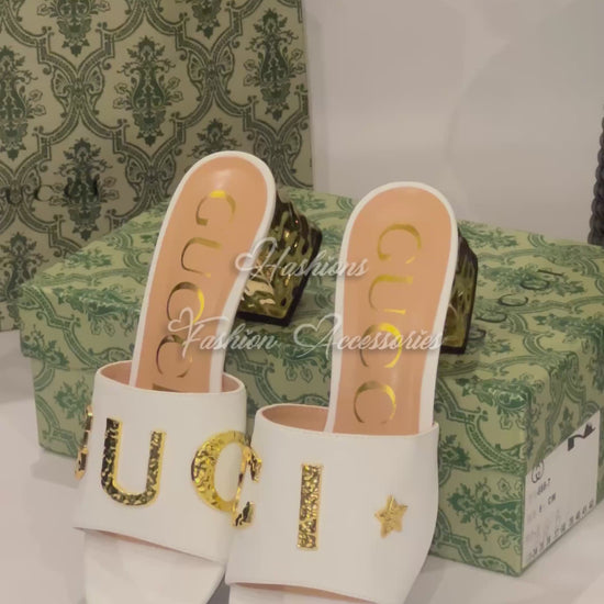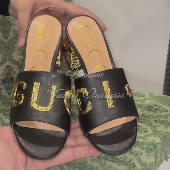 Elevate your look with these Gold Accent Block Heels, a perfect blend of statement style and timeless sophistication. Featuring bold gold letter detailing and a textured metallic heel, these slides bring a touch of glamour to every outfit.