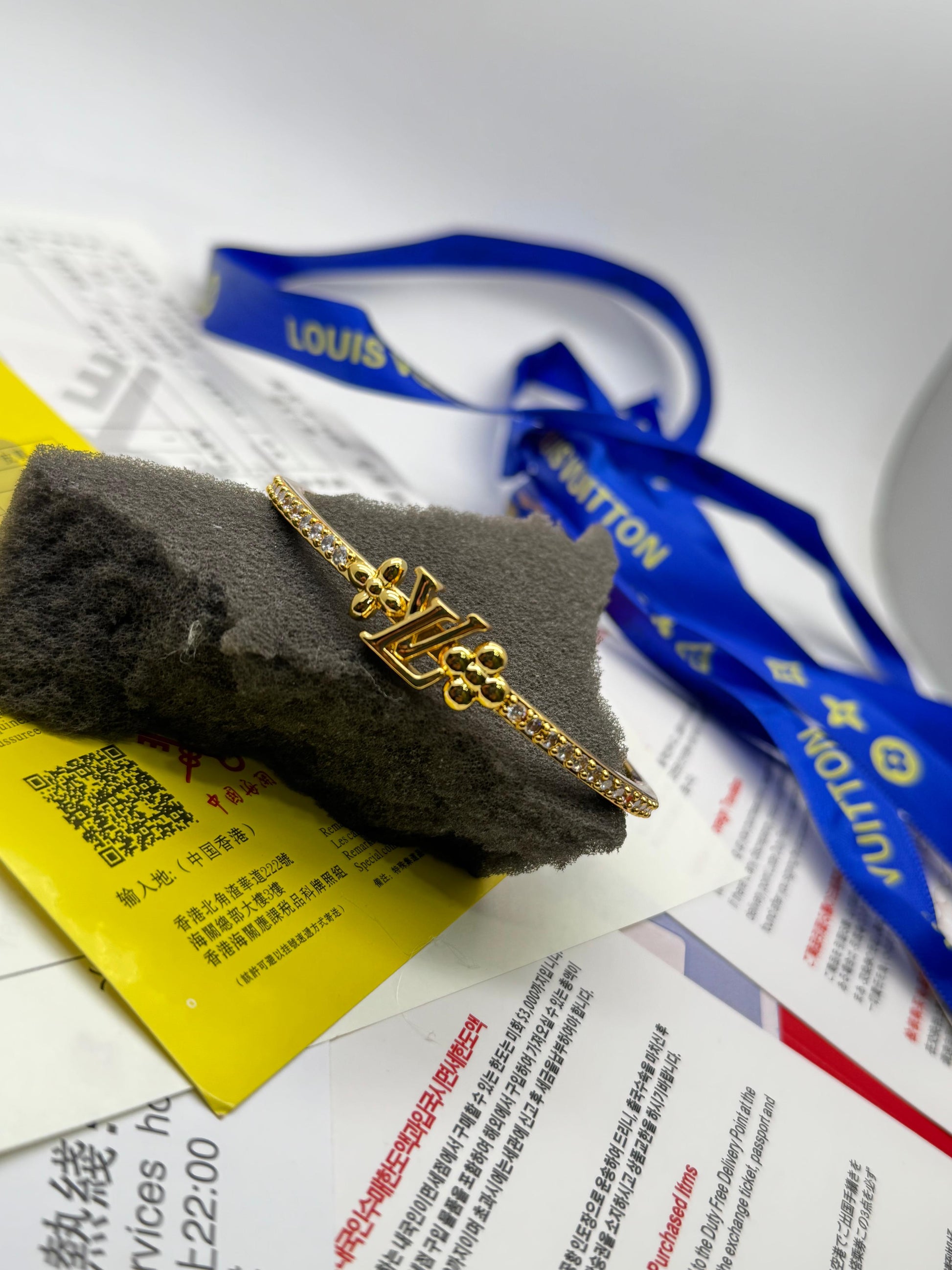 Elevate your look with this gold-plated crystal bangle, designed to blend luxury and simplicity. Featuring a sleek open design with a signature-style center and a row of sparkling stones, it adds the perfect amount of shine for both everyday elegance and special occasions.