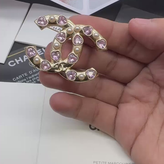 Gold Tone Interlocking C Brooch with Pink Crystal Hearts & Pearls – Luxury Statement Pin