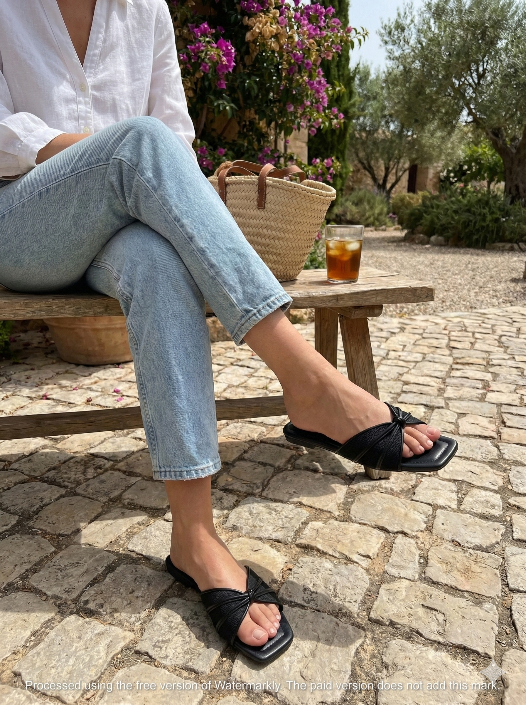 Step into sophisticated glamour with these women's metallic knot slide sandals. Featuring a trendy square toe and a stylish knotted mesh bow strap, these flats blend texture and shine perfectly. The shimmering gold metallic finish makes them ideal dressy flats for parties, weddings, or any evening event. The easy slip-on design and comfortable flat sole provide effortless style. A modern twist on the classic bow sandal, these are a must-have statement piece. Also available in classic Black.