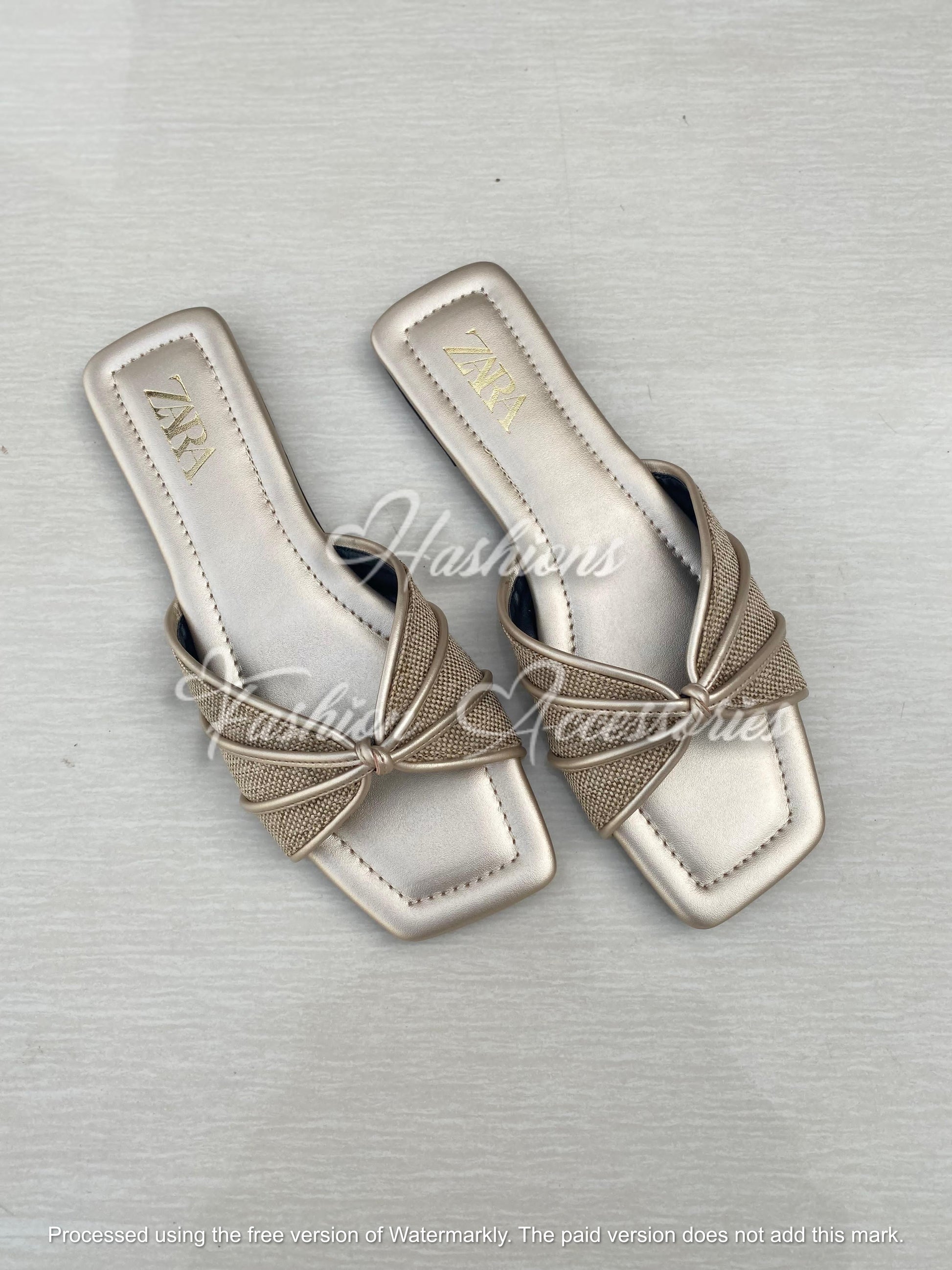 Gold Metallic Knot Slide Sandals - Mesh Bow Square Toe Flats