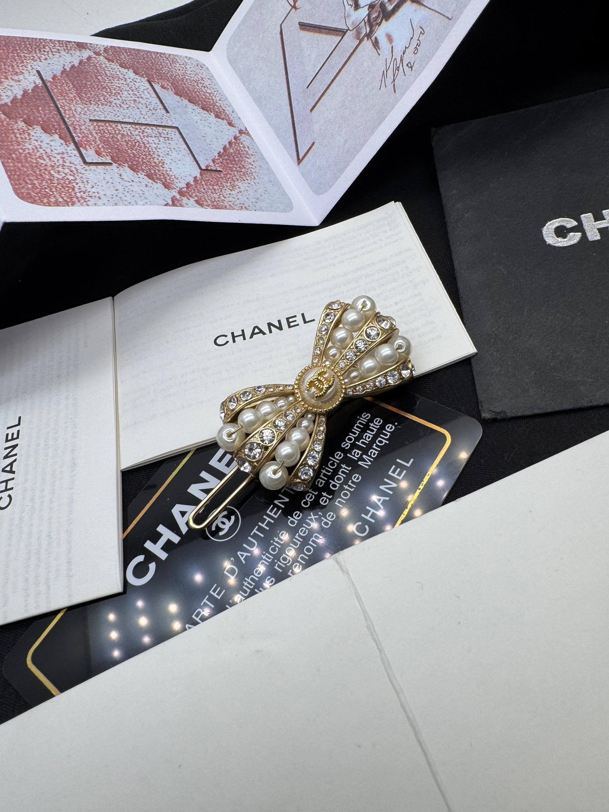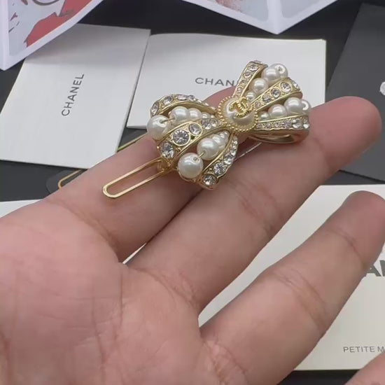 Gold Tone Pearl & Crystal Bow Hair Clip – Luxury Rhinestone Ribbon Barrette