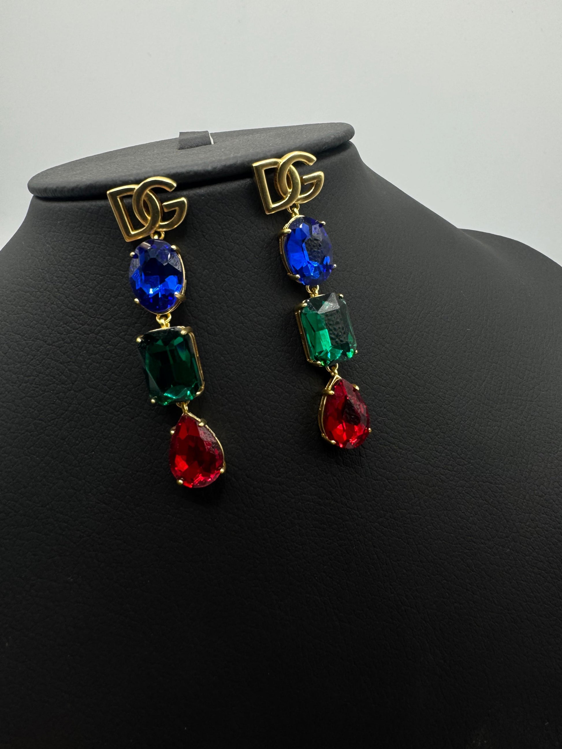 Turn heads with these striking gold-tone multicolor crystal drop earrings, crafted for women who love bold elegance and refined glamour. Designed with a vertical trio of richly faceted crystals in deep blue, emerald green, and ruby red tones, these earrings offer a luxurious, high-impact look.