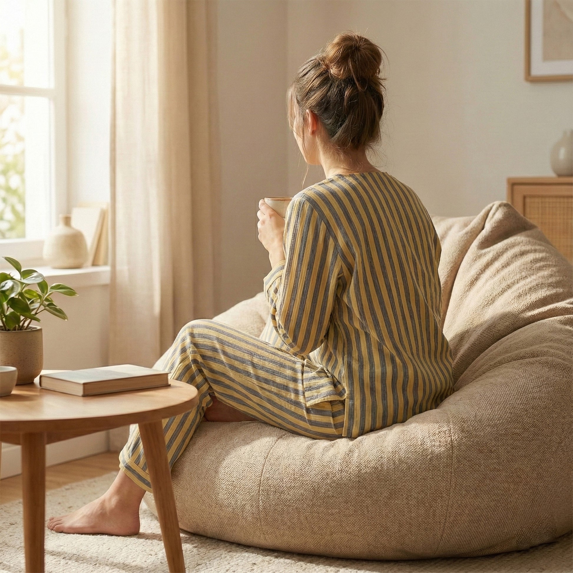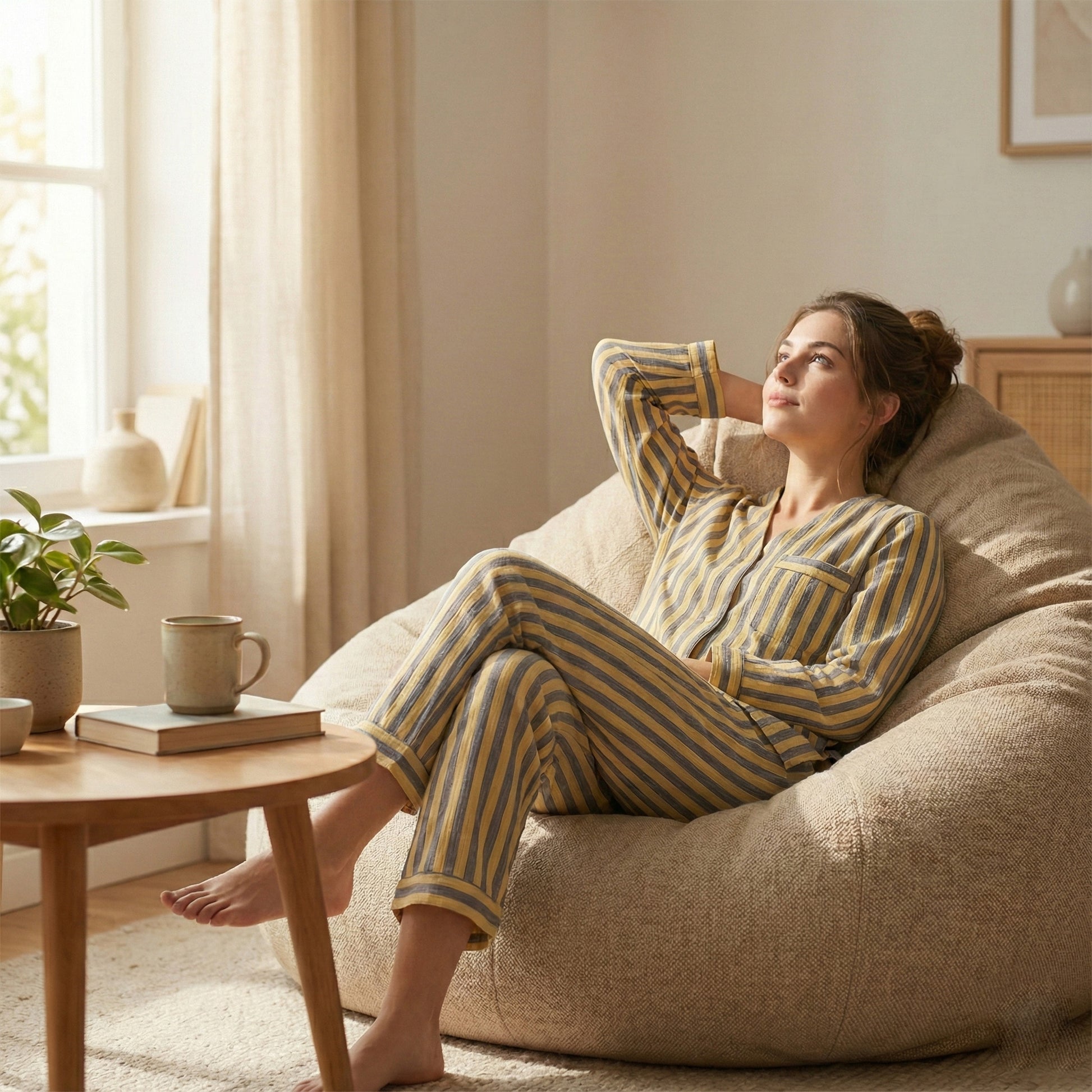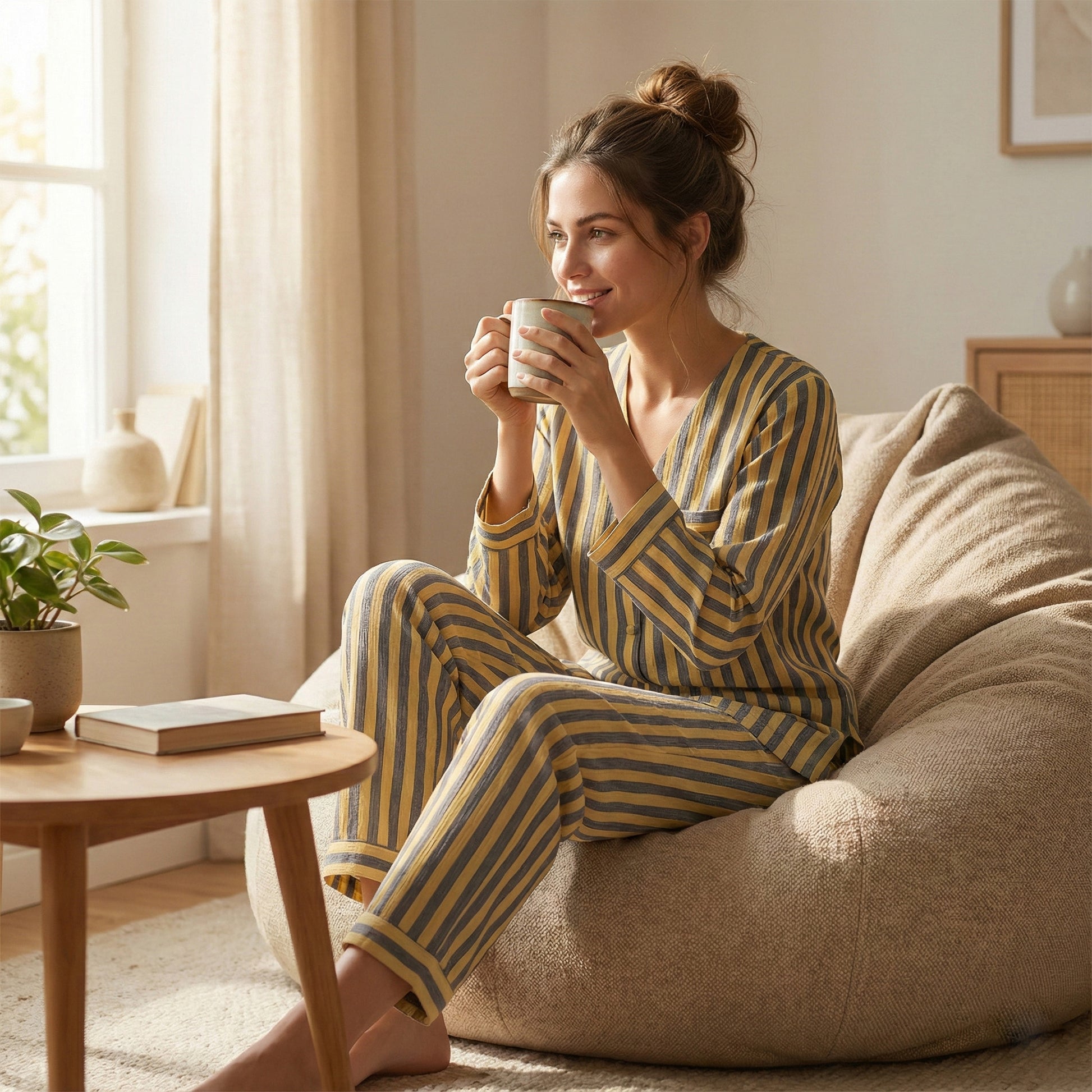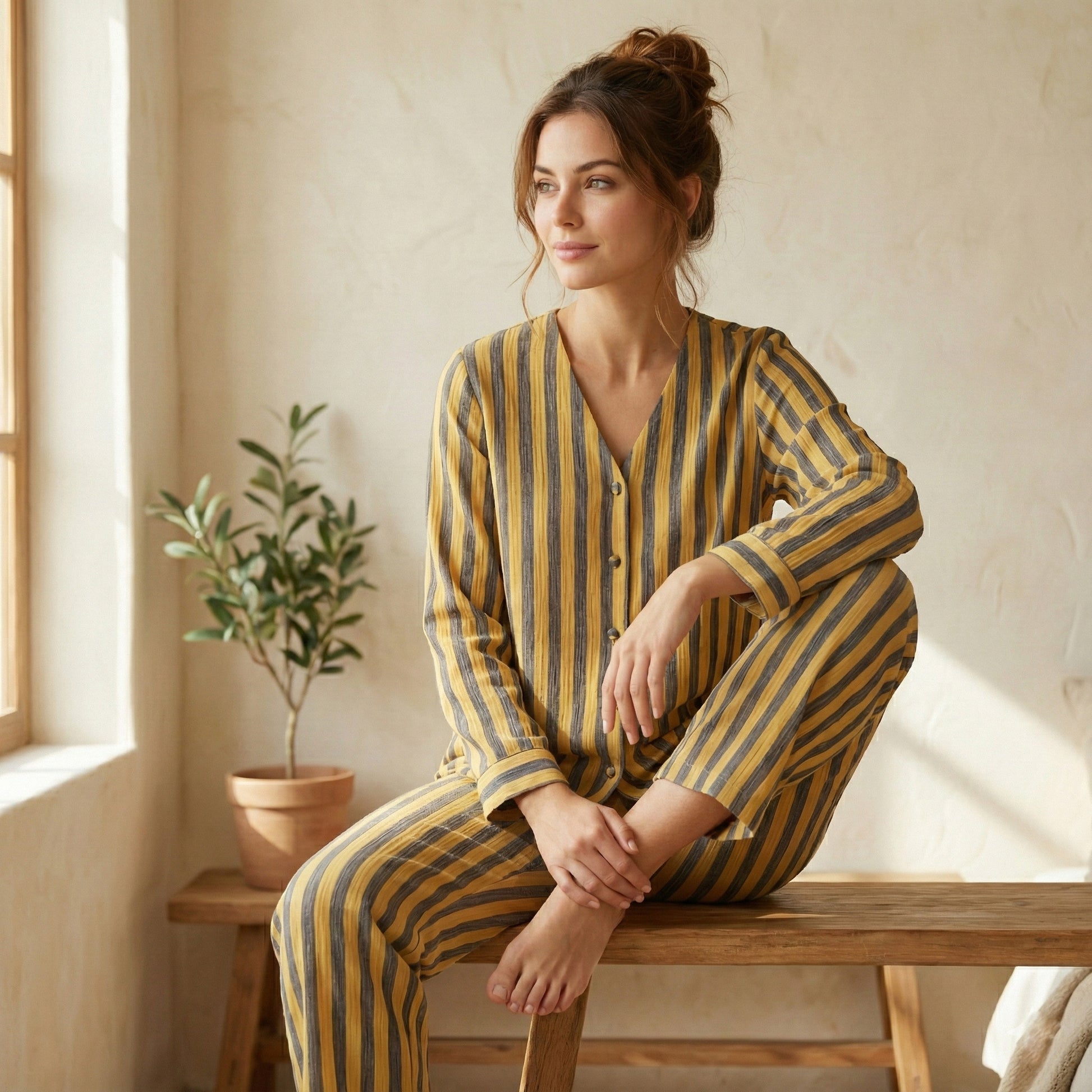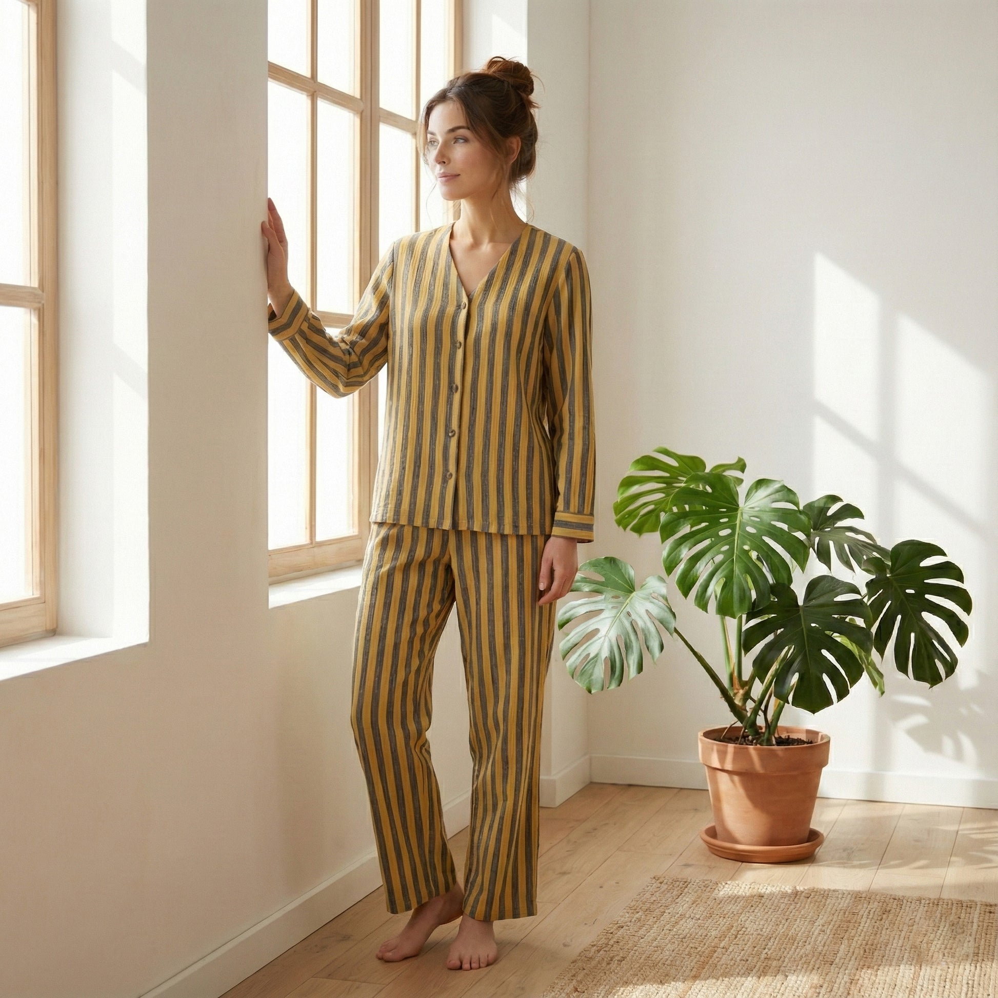 The vertical stripes in muted gold and earthy tones evoke balance and optimism, while the button-down top adds gentle structure to a relaxed, effortless fit. Paired with straight-leg trousers, Golden Horizon moves seamlessly from reflective mornings with coffee in hand to quiet evenings spent unwinding at home.