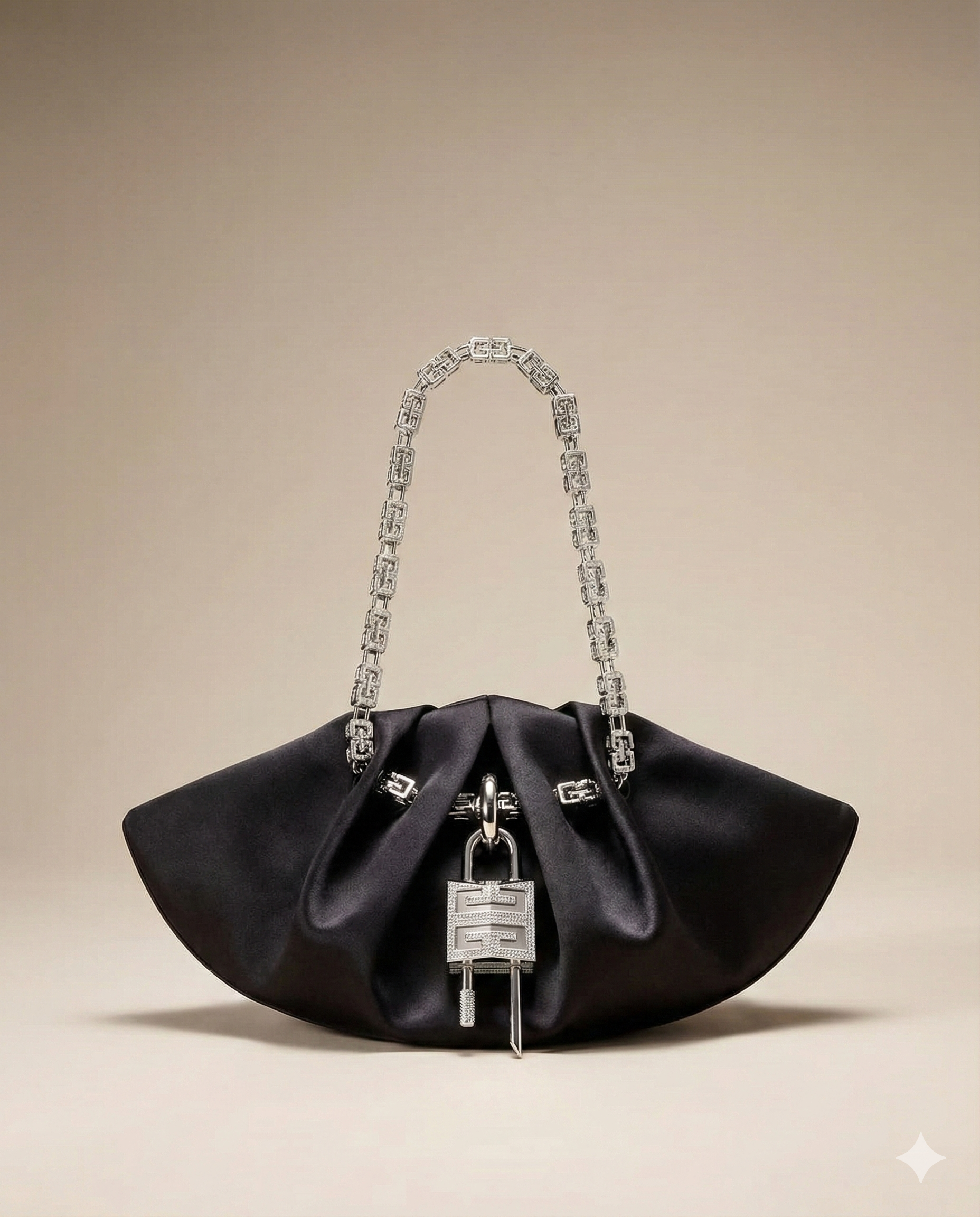 Turn heads with this fan-shape chain handle clutch bag, a luxury-look evening piece designed for women who love standout accessories. Crafted from premium faux leather, it features an elegant draped fan silhouette and a bold silver-metal chain strap that doubles as both a handle and a statement jewelry-like detail.