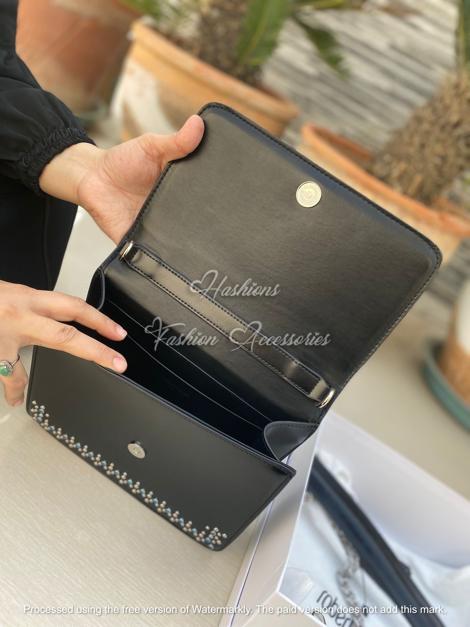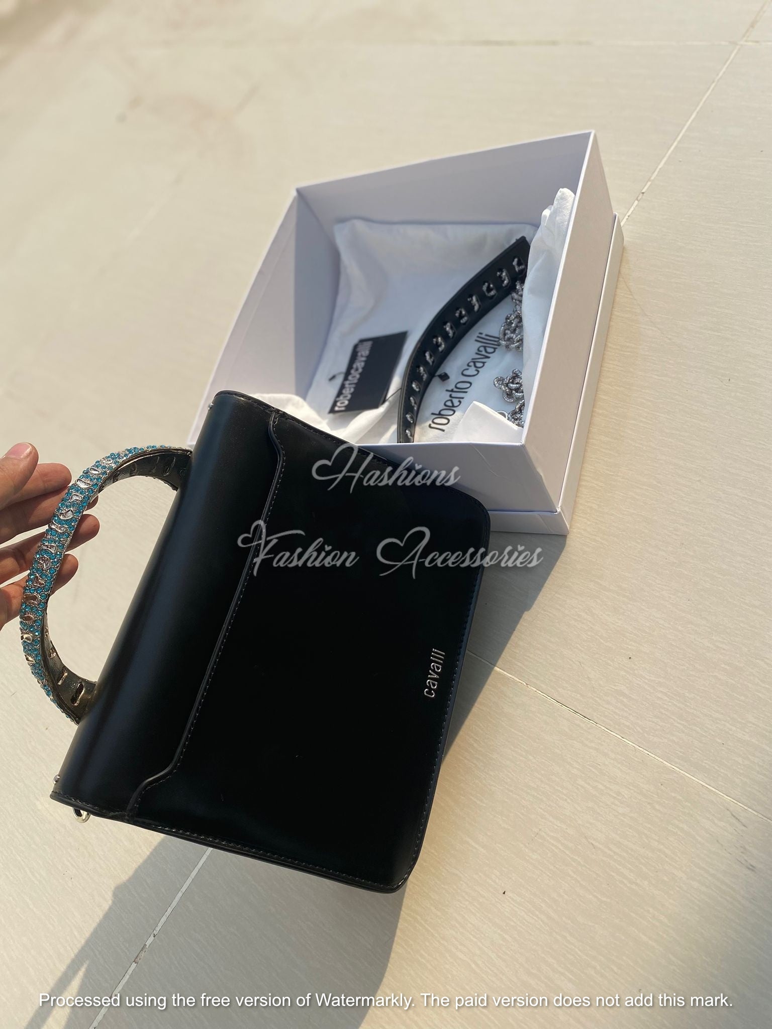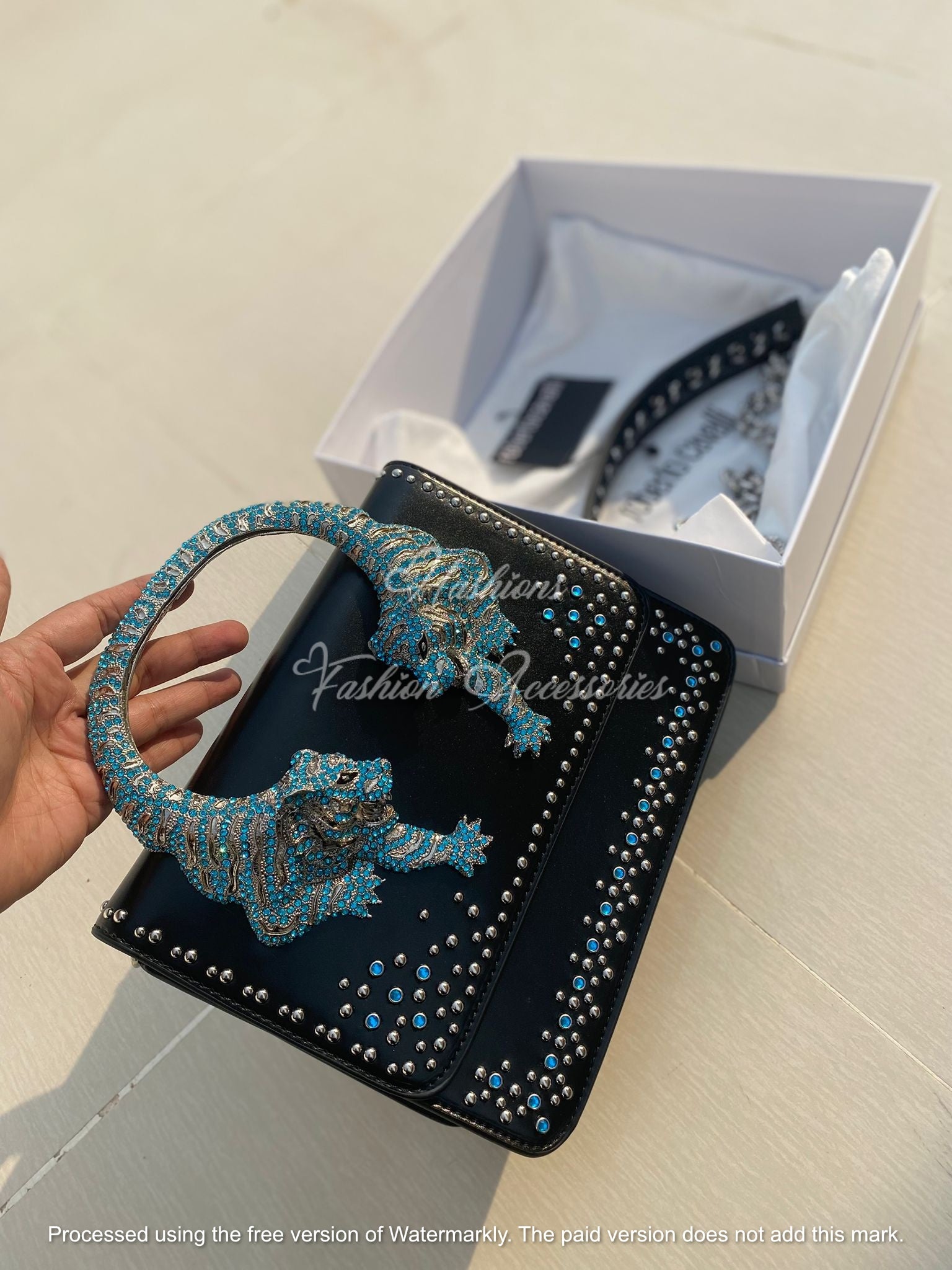 Command attention with this luxury jewelled handle handbag, designed for those who love daring elegance. Crafted in sleek black vegan leather, this structured masterpiece features twin tiger-shaped handles embellished with blue crystals and silver studs that redefine bold sophistication.
