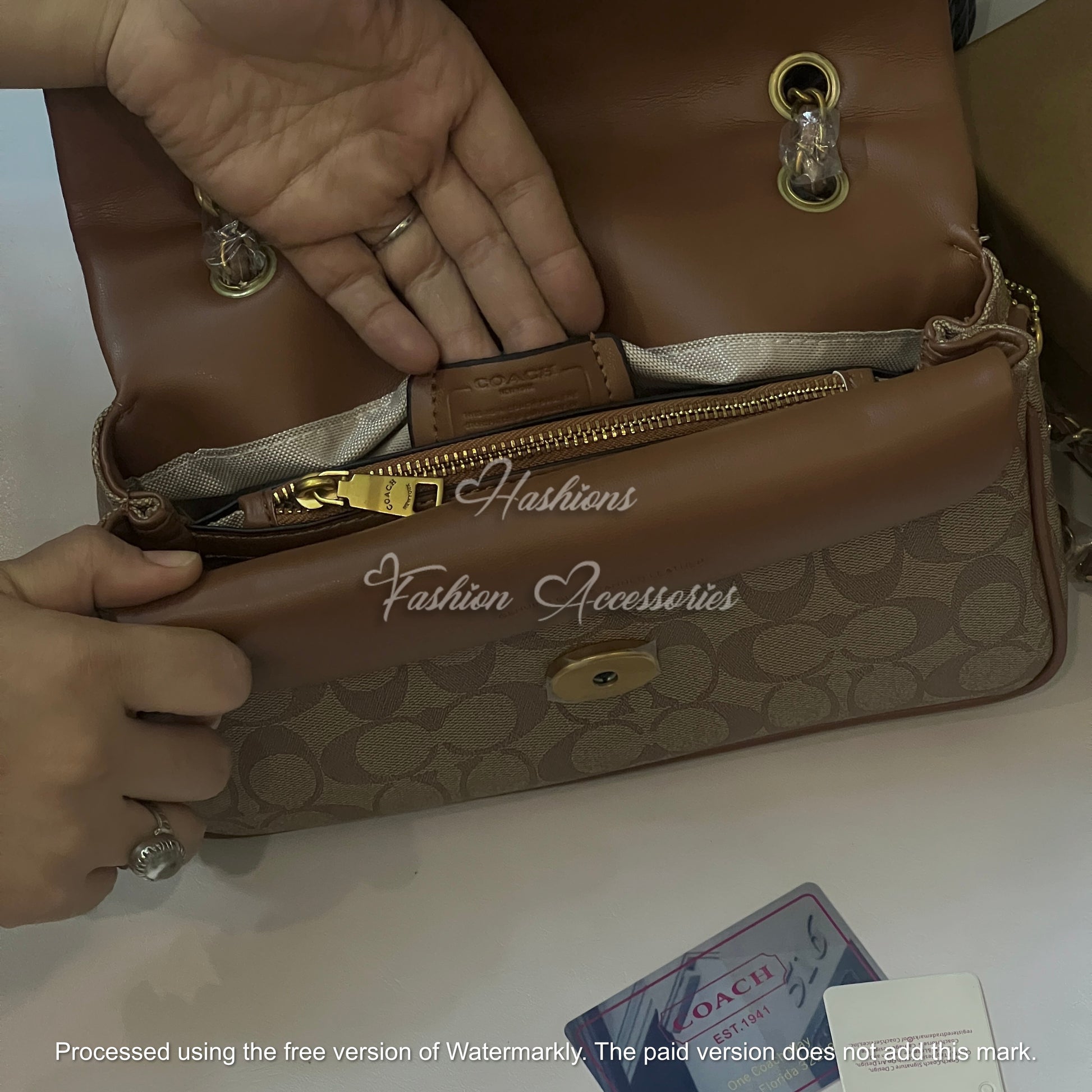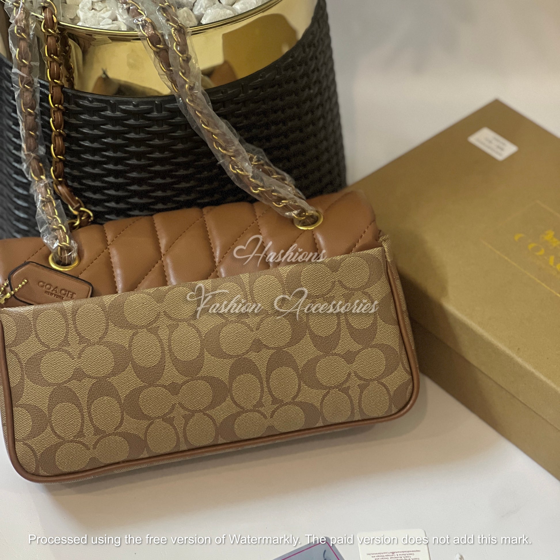 Meet your new go-everywhere shoulder bag: a compact, quilted-flap design crafted in durable signature-pattern coated canvas with a luxe chain-weave strap and gold-tone hardware. The front flap closes securely, revealing a fabric-lined interior with a zipper pocket to keep essentials organized. Wear it on the shoulder or crossbody for hands-free ease—perfect from daytime errands to dinner plans.