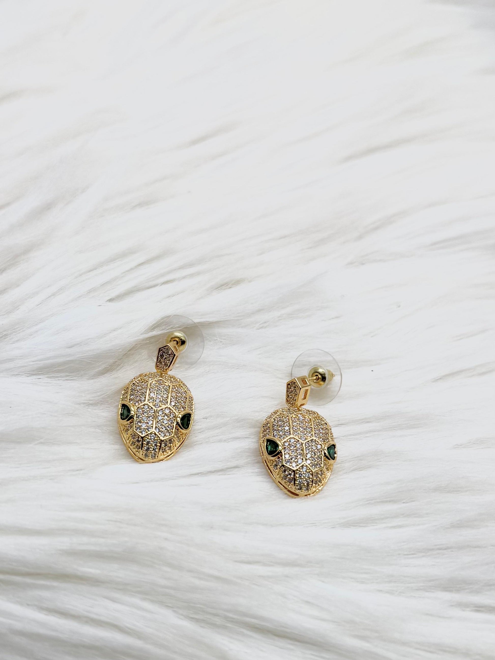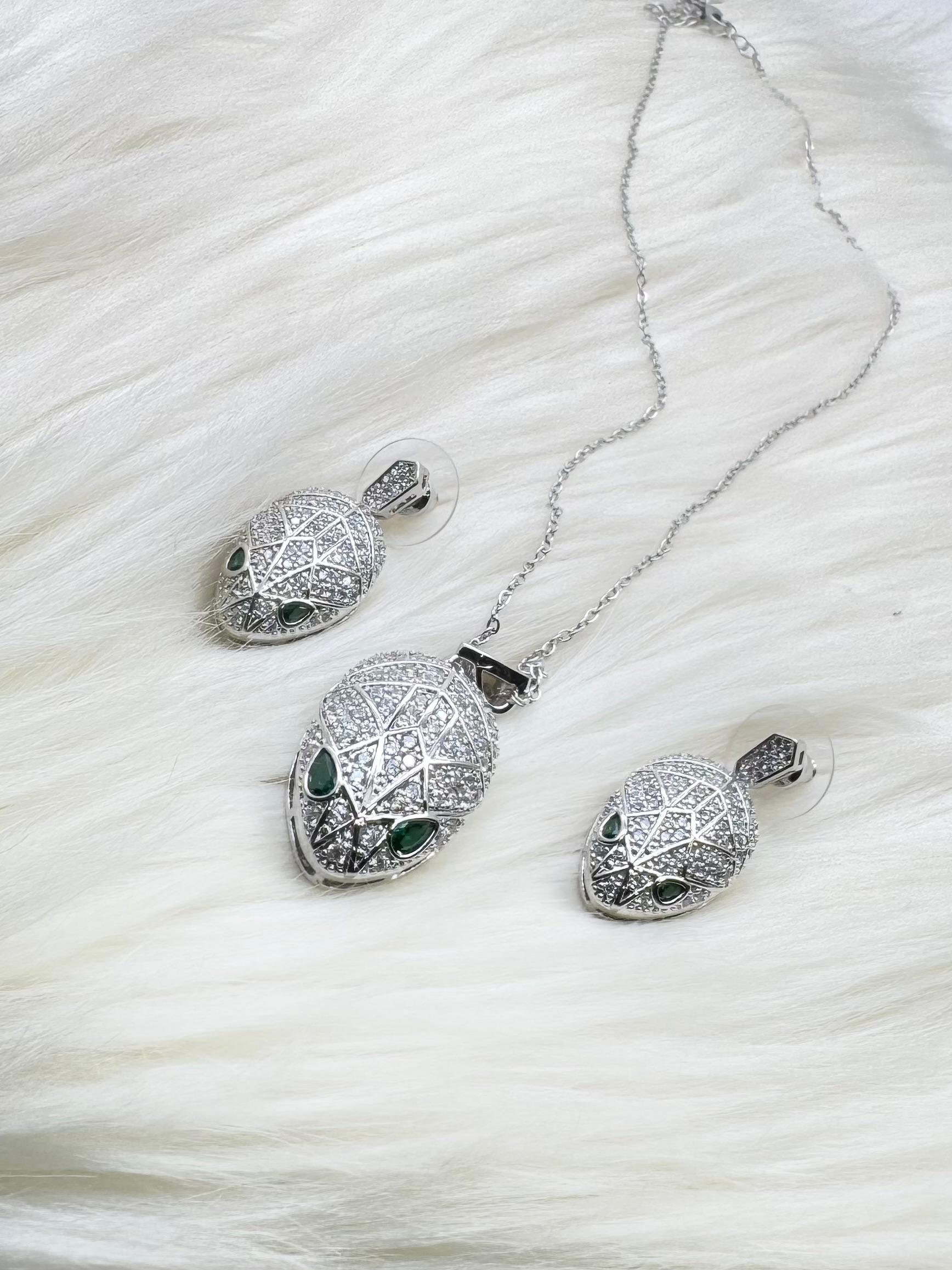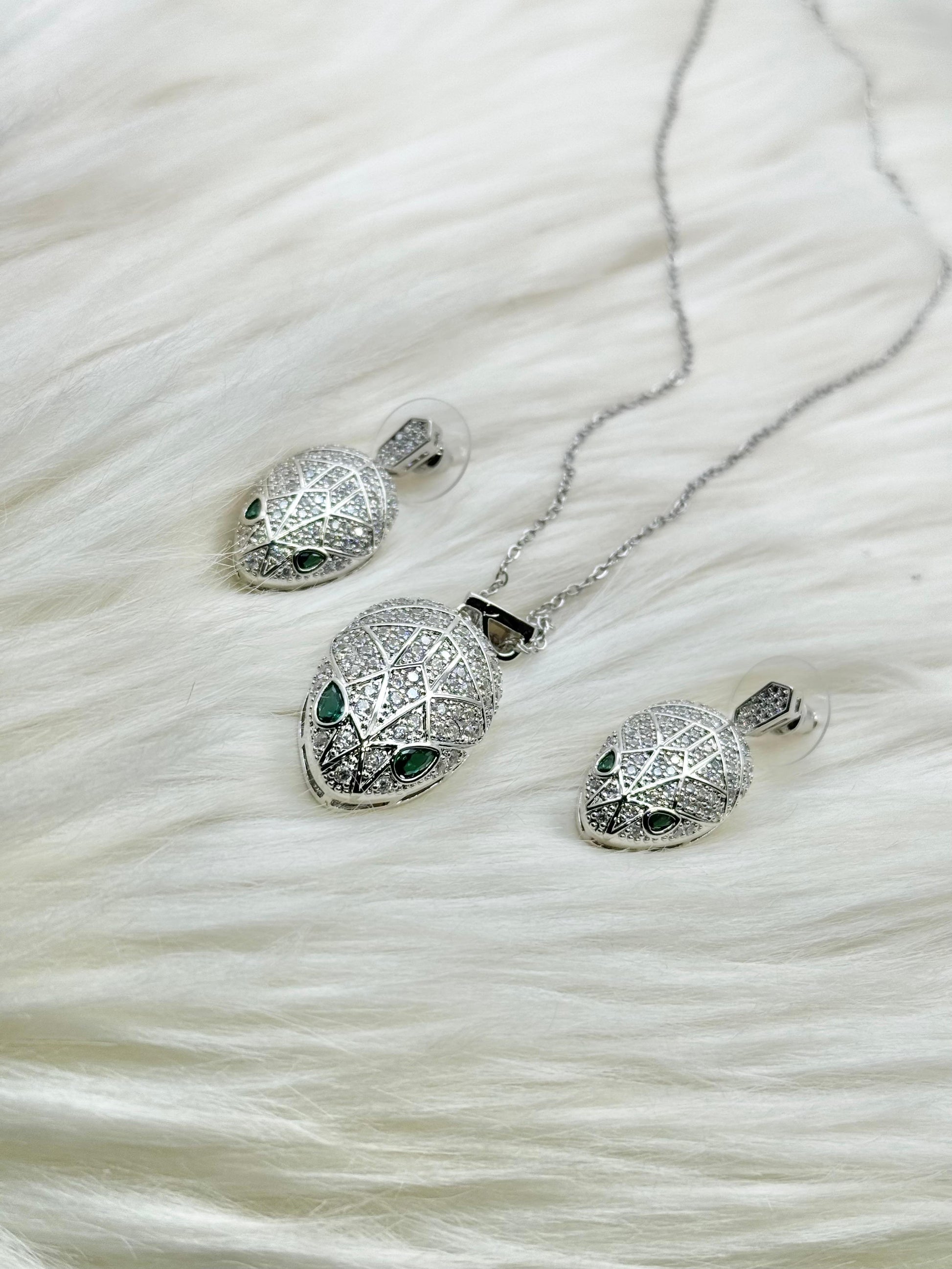 Elevate your evening look with this luxury snake-inspired necklace and earrings set, crafted with exquisite detailing and shimmering crystal accents. Each piece features a bold serpentine motif adorned with pave-set cubic zirconia stones and deep green eyes that add a hint of mystique.